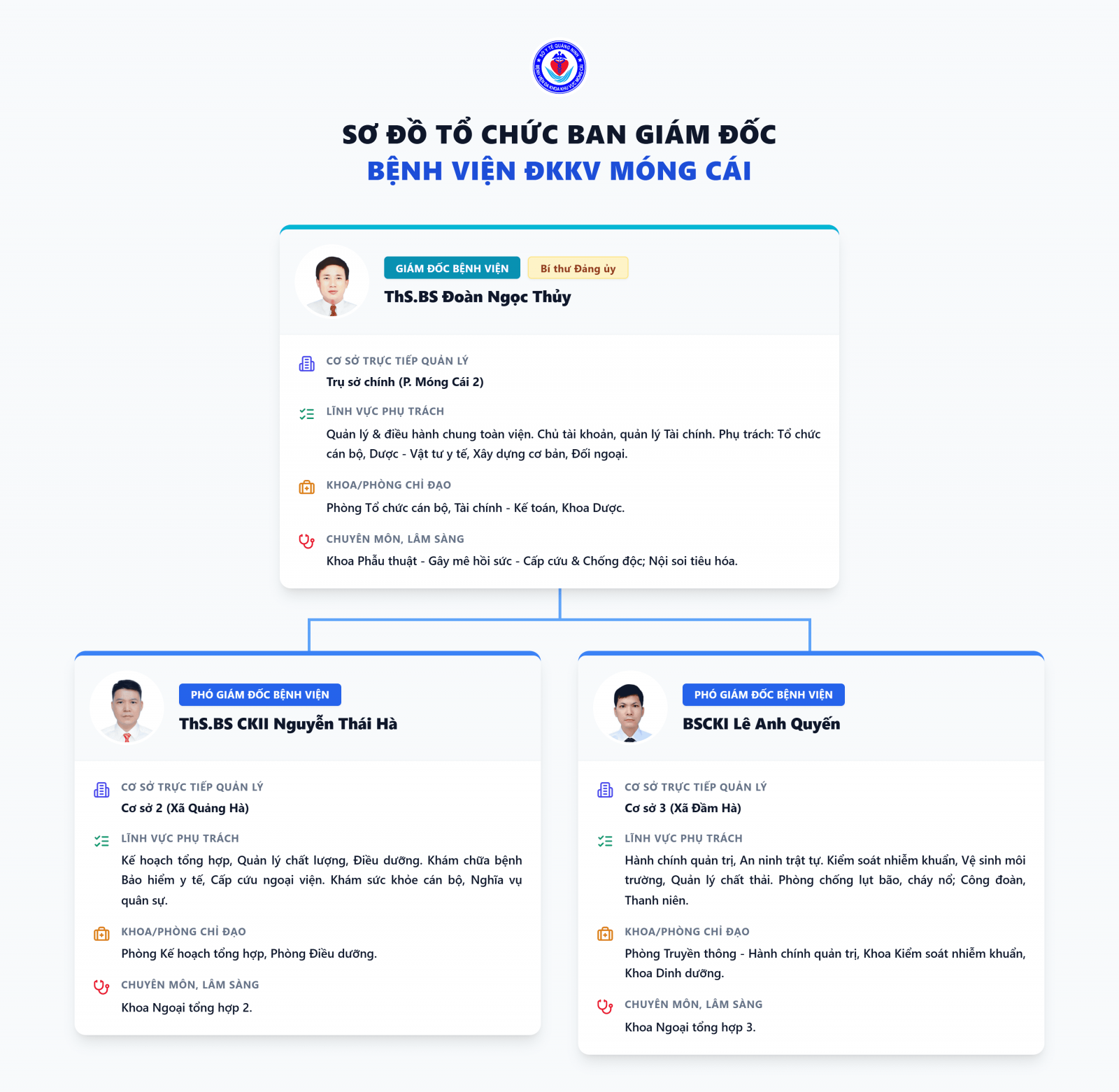 Bệnh viện Đa khoa khu vực Móng Cái hiện nay đứng trước vận hội phát triển mới với mô hình sáp nhập quy mô lớn, gồm 3 cơ sở (tại Thành phố Móng Cái, huyện Hải Hà và huyện Đầm Hà cũ). Để vận hành bộ máy y tế khám chữa bệnh ban đầu của cả khu vực miền đông tỉnh Quảng Ninh, Ban Giám đốc bệnh viện là sự kết hợp của những trí thức tiêu biểu, hội tụ đầy đủ bản lĩnh quản trị hiện đại, năng lực chuyên môn cao và một trái tim y đức luôn hướng về cộng đồng.