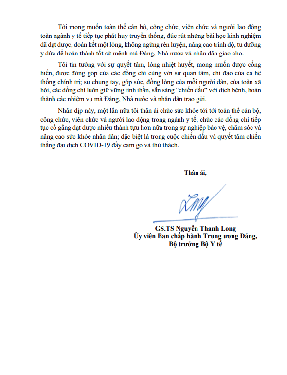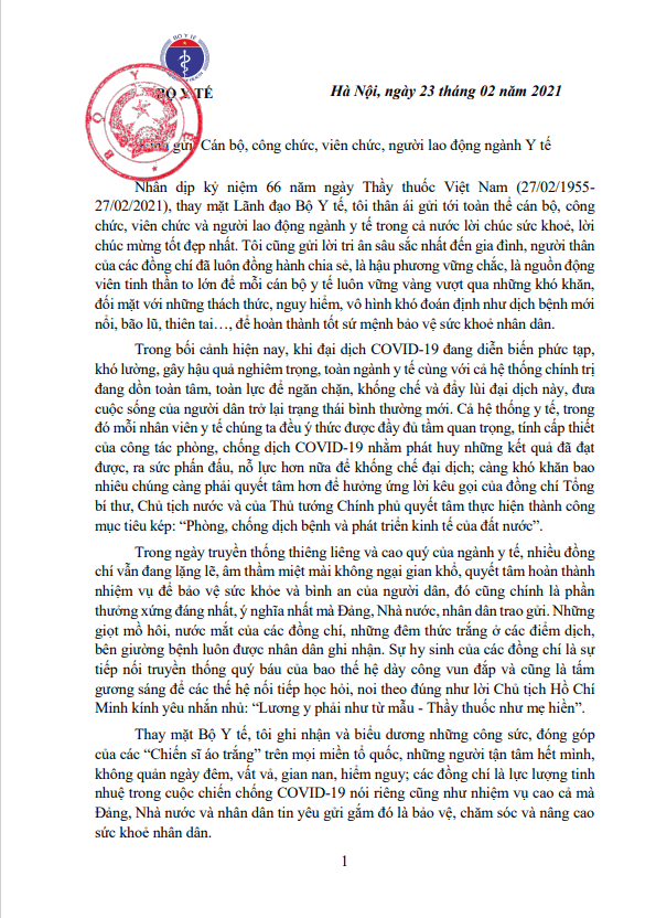 Thứ 4, 24/02/2021 | 08:43 A- A A+ | Thư chúc mừng của Bộ Trưởng Bộ Y tế nhân dịp kỷ niệm 66 năm ngày Thầy thuốc Việt Nam (27/02/1955-27/02/2021) Đọc bài Lưu Tổng số điểm của bài viết là: 0 trong 0 đánh giá Click để đánh giá bài viết