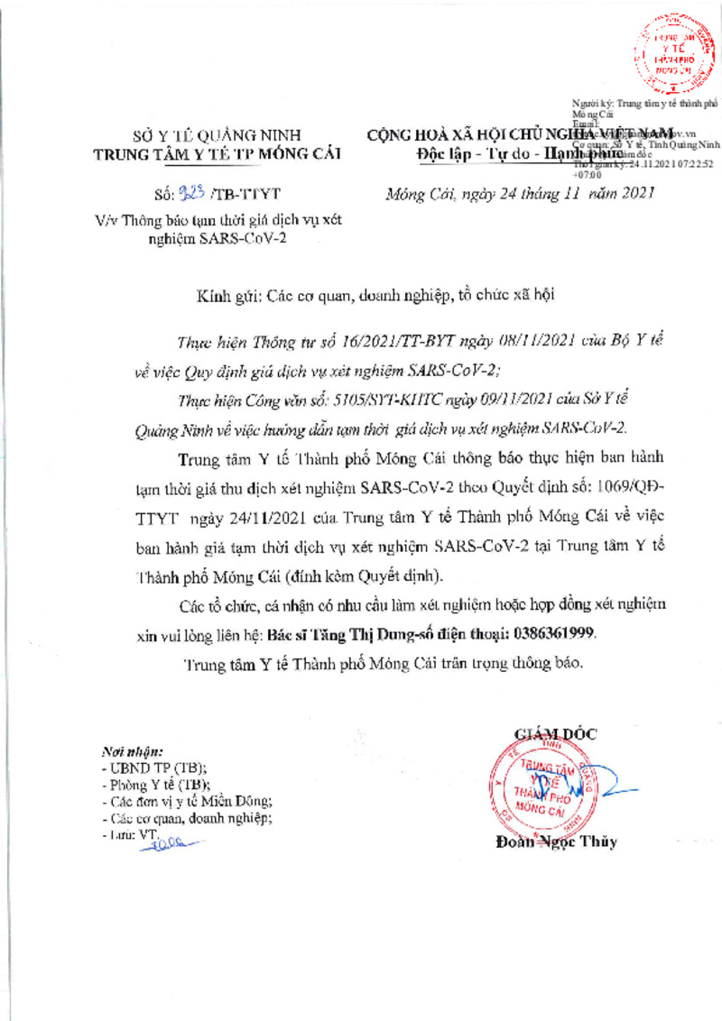 CV số ngày 24/11/2021 của Trung tâm Y tế TP Móng Cái V/v Thông báo tạm thời giá dịch vụ xét nghiệm SARS-CoV-2