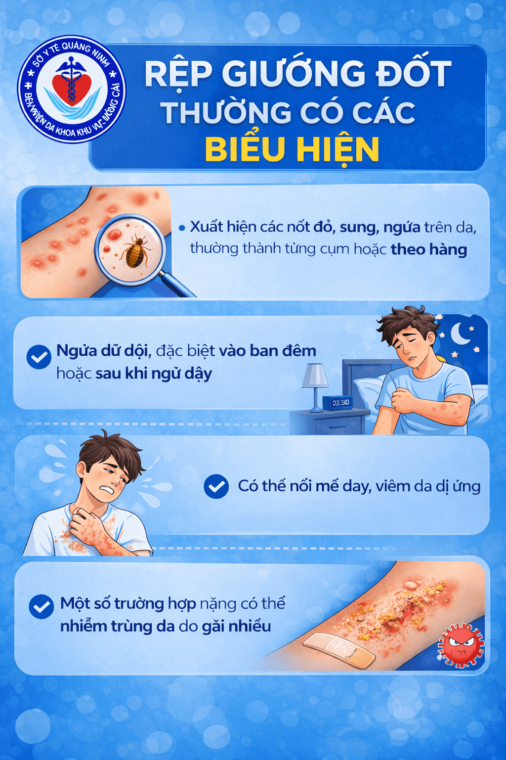 Khi có các biểu hiện bất thường trên da như ngứa kéo dài, nổi mẩn, vết đốt nghi do côn trùng, người dân không nên chủ quan mà cần đến cơ sở y tế để được thăm khám và điều trị kịp thời. Bệnh viện Đa khoa Khu vực Móng Cái khuyến cáo cộng đồng nâng cao ý thức vệ sinh môi trường sống, đặc biệt là khu vực giường ngủ – nơi tiềm ẩn nhiều nguy cơ nhưng dễ bị bỏ quên.