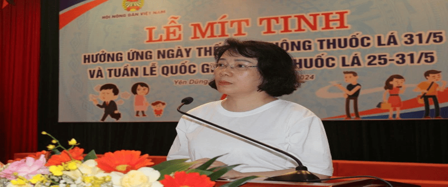 ThS.Phan Thị Hải, Phó Giám đốc Phụ trách Quỹ Phòng chống tác hại của thuốc lá phát biểu tại Lễ mít tinh hưởng ứng Ngày thế giới không khói thuốc lá 31/5/2024 và Tuần lễ Quốc gia không khói thuốc lá từ 25-31/5 năm 2024 do Trung ương Hội Nông dân Việt Nam phối hợp với Quỹ Phòng chống tác hại của Thuốc lá, Bộ Y tế tổ chức.