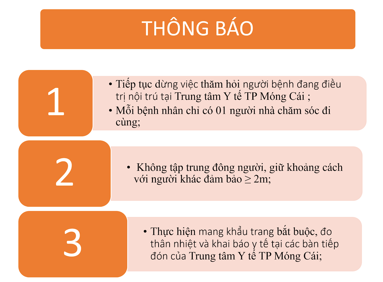- Tiếp tục dừng việc thăm hỏi người bệnh đang điều trị nội trú tại Trung tâm Y tế TP Móng Cái ;