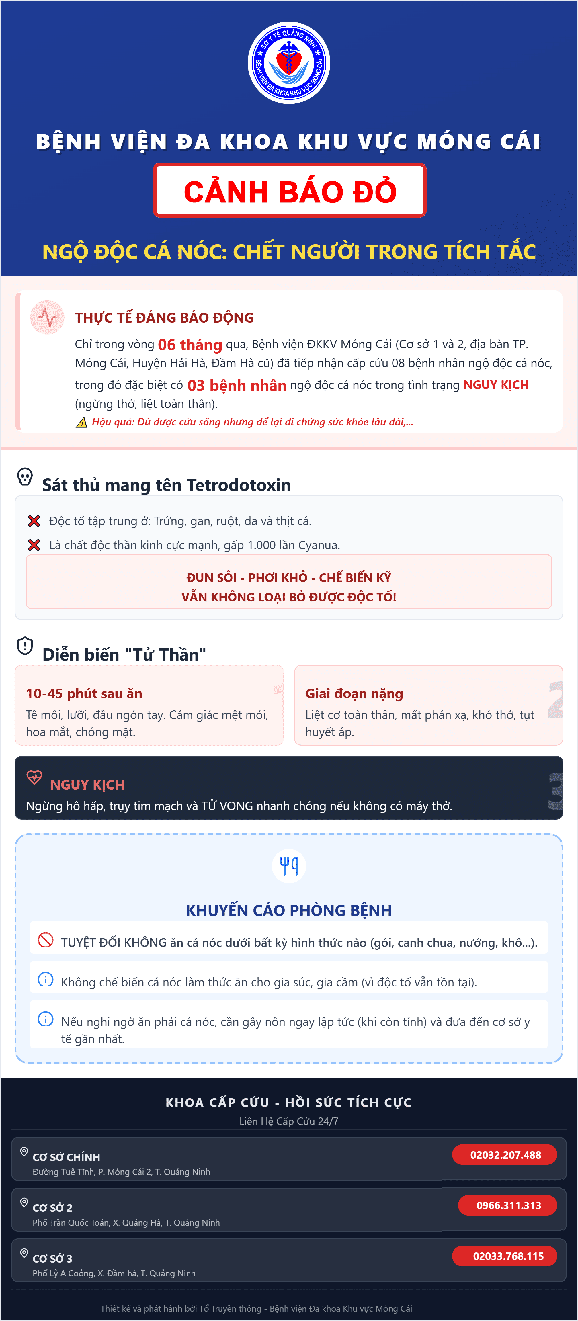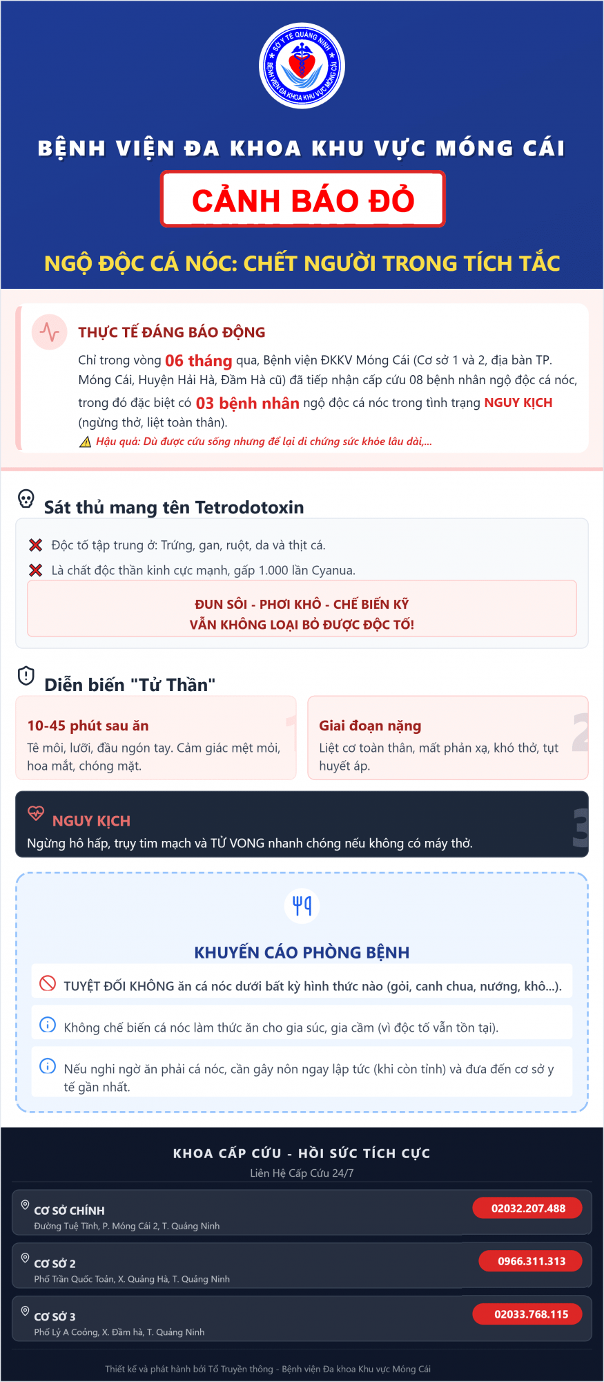 Đừng để bữa ăn ngon trở thành bi kịch! Thời gian vừa qua, tình trạng ngộ độc cá nóc đang ở mức báo động. Chỉ trong 6 tháng, Bệnh viện ĐKKV Móng Cái đã tiếp nhận 08 ca cấp cứu, trong đó có 03 ca nguy kịch (ngừng thở, liệt toàn thân). Dù được cứu sống, nạn nhân vẫn phải đối mặt với những di chứng sức khỏe kéo dài
