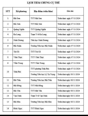 Thực hiện kế hoạch số 1100/KH-TTYT ngày 22/8/2024 về việc triển khai tiêm bổ sung vắc xin Uốn ván- Bạch hầu giảm liều (Td) trên địa bàn thành phố Móng Cái năm 2024;