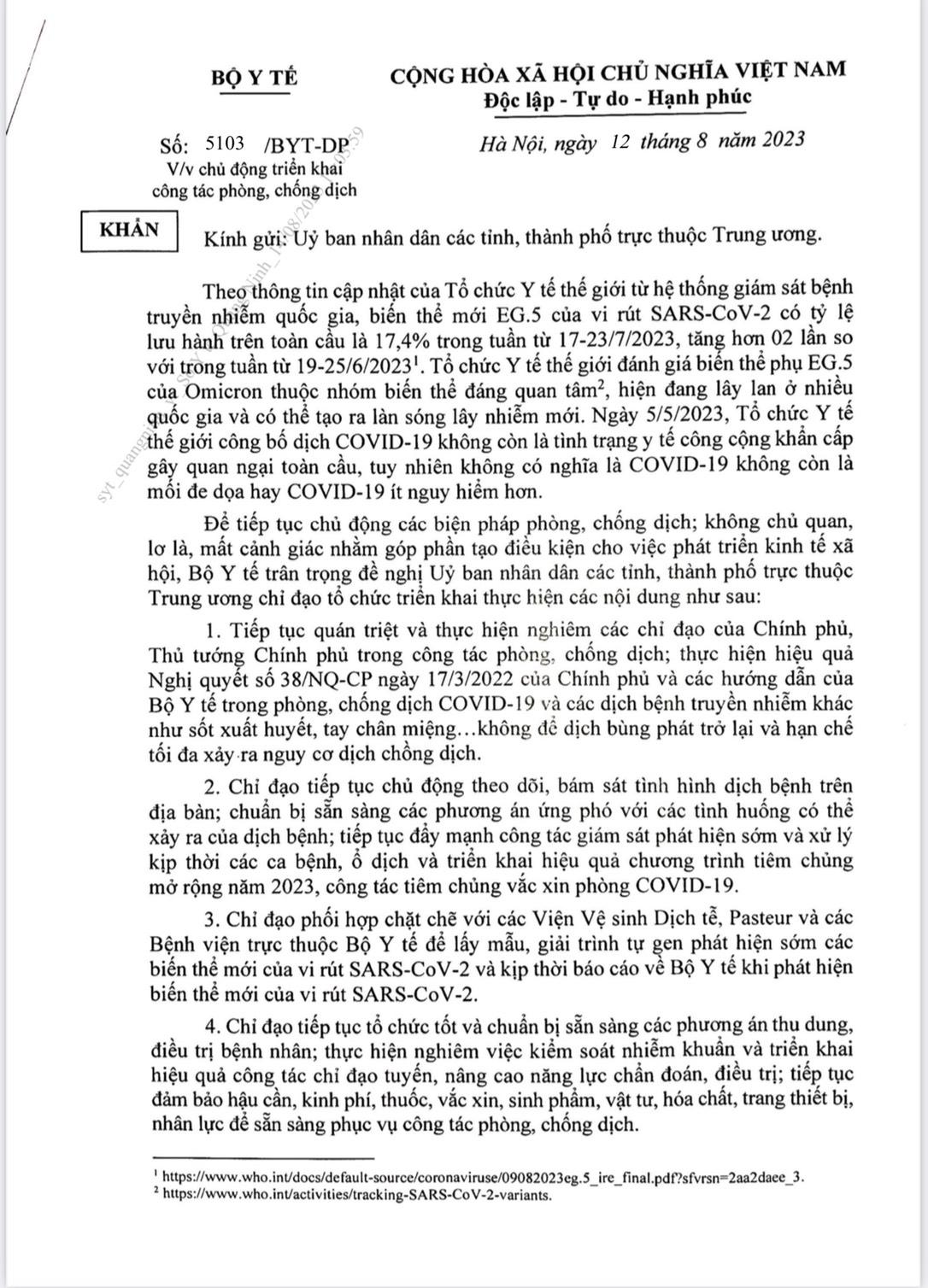 Theo thông tin cập nhật của Tổ chức Y tế thế giới từ hệ thống giám sát bệnh truyền nhiễm quốc gia, biến thể mới EG.5 của vi rút SARS-CoV-2 có tỷ lệ lưu hành trên toàn cầu là 17,4% trong tuần từ 17-23/7/2023, tăng hơn 02 lần so với trong tuần từ 19-25/6/2023. Tổ chức Y tế thế giới đánh giá biến thể phụ EG.5 của Omicron thuộc nhóm biến thể đáng quan tâm, hiện đang lây lan ở nhiều quốc gia và có thể tạo ra làn sóng lây nhiễm mới. Ngày 5/5/2023, Tổ chức Y tế thế giới công bố dịch COVID-19 không còn là tình trạng y tế công cộng khẩn cấp gây quan ngại toàn cầu, tuy nhiên không có nghĩa là COVID-19 không còn là mối đe dọa hay COVID-19 ít nguy hiểm hơn.