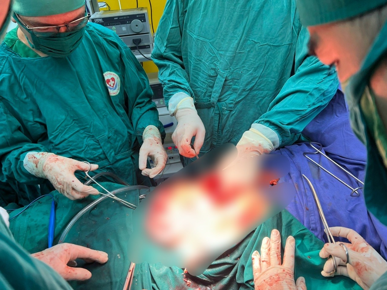 Ekip Bs.CKI Vũ Thế Cầu– Phó Trưởng Khoa Ngoại, Bs. CKI Phạm Bình Dương, Bs Đặng Văn Thanh cùng kỹ thuật viên Trung tâm Y tế TP Móng Cái đã tiến hành mở ổ bụng kiểm tra thấy ổ bụng có khoảng 2000 ml máu đỏ tươi, lẫn máu cục kèm theo dịch thức ăn, lách có đường vỡ từ nhu mô tới rốn lách, đứt cuống mạch lách. Mặt sau dạ dày có đường vỡ đk 4cm, trào dịch thức ăn vào hậu cung mạc nối. Thủng ruột non 2 lỗ đk lần lượt 1,5cm và 0,5cm kèm rách thanh mạc đại tràng ngang, chấn thương dập cực trên thận trái.