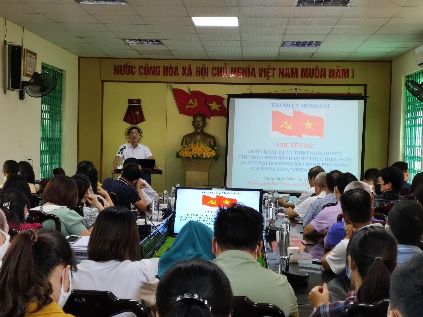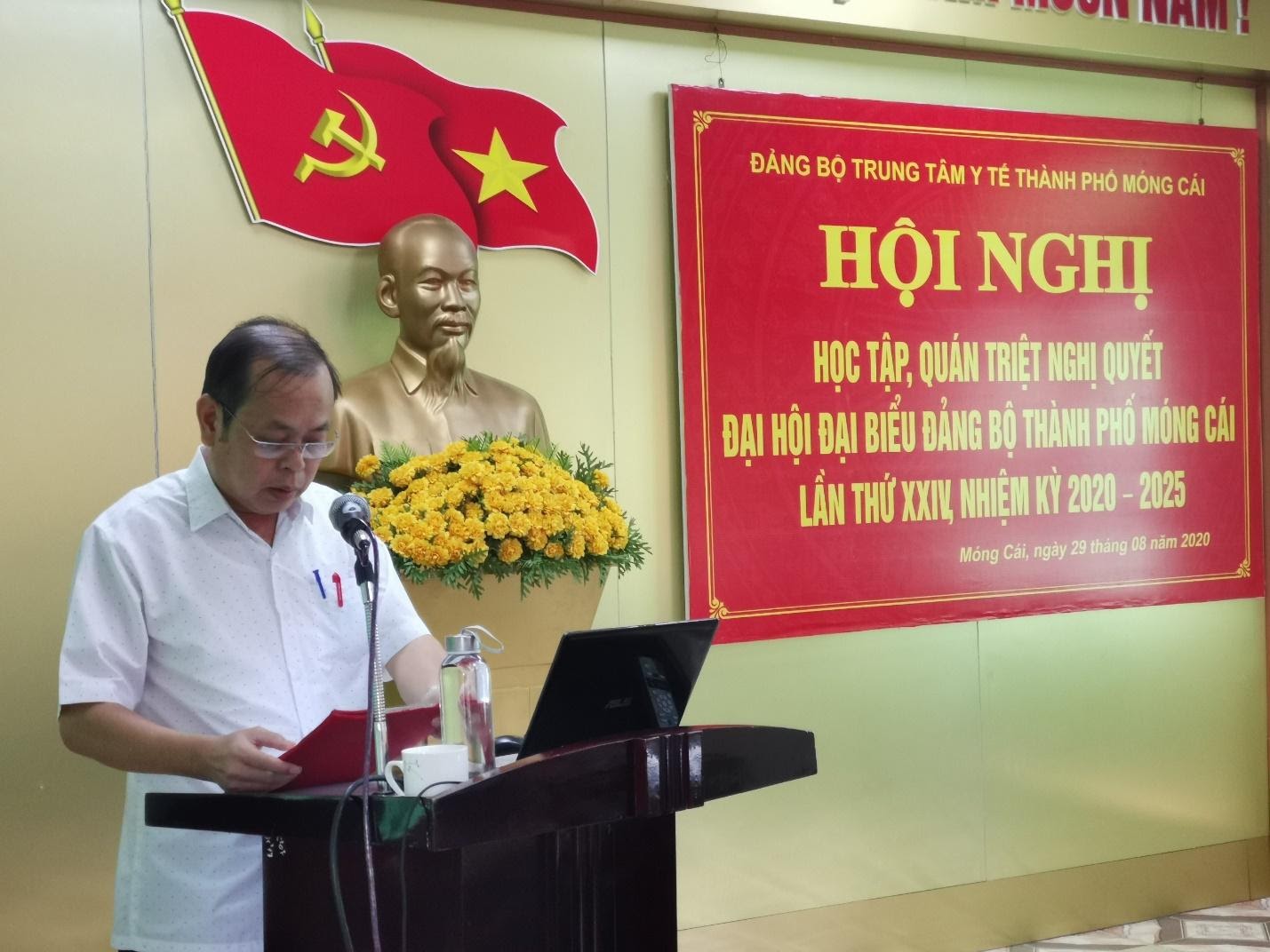 Tại hội nghị, trên 100 cán bộ, đảng viên và người lao động của Trung tâm Y tế thành phố Móng Cái đã được nghe đồng chí Vũ Việt Hưng - Phó Ban Tuyên giáo Thành ủy Móng Cái quán triệt về Nghị quyết đại hội đại biểu Đảng bộ thành phố Móng Cái lần thứ XXIV, nhiệm kỳ 2020 - 2025. Đại hội đã đánh giá toàn diện kết quả thực hiện nghị quyết đại hội đảng bộ lần thứ XXIII, chỉ rõ ưu khuyết điểm nguyên nhân và bài học kinh nghiệm; xác định phương hướng, nhiệm vụ với mục tiêu tổng quát: “Nâng cao năng lực lãnh đạo, sức chiến đấu của Đảng bộ; huy động sức mạnh tổng hợp của cả hệ thống chính trị, tập trung khai thác hiệu quả tiềm năng, lợi thế khu kinh tế cửa khẩu, phát triển hệ thống kết cấu hạ tầng đồng bộ, hiện đại; có mạng lưới dịch vụ hoàn thiện. phát triển các lĩnh vực văn hóa – xã hội, nâng cao đời sống vật chất và tinh thần của nhân dân. Bảo đảm vững chắc quốc phòng – an ninh; nâng cao hiệu quả quan hệ đối ngoại và hội nhập quốc tế; xây dựng khu vực biên giới hòa bình, hữu nghị, hợp tác cùng phát triển. Xây dựng Móng Cái trở thành trung tâm dịch vụ thương mại, du lịch, cảng biển trọng điểm của tỉnh Quảng Ninh”; Đại hội đề ra các nhiệm vụ, giải pháp quan trọng có tính đột phá nhằm đẩy mạnh toàn diện đồng bộ công cuộc đổi mới, thúc đẩy phát triển kinh tế - xã hội của thành phố góp phần nâng cao đời sống vật chất và tinh thần của nhân dân.