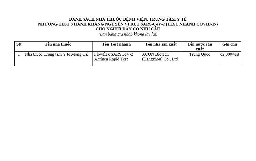 DANH SÁCH NHÀ THUỐC BỆNH VIỆN, TRUNG TÂM Y TẾ NHƯỢNG TEST NHANH KHÁNG NGUYÊN VI RÚT SARS-CoV-2 (TEST NHANH COVID-19) CHO NGƯỜI DÂN CÓ NHU CẦU