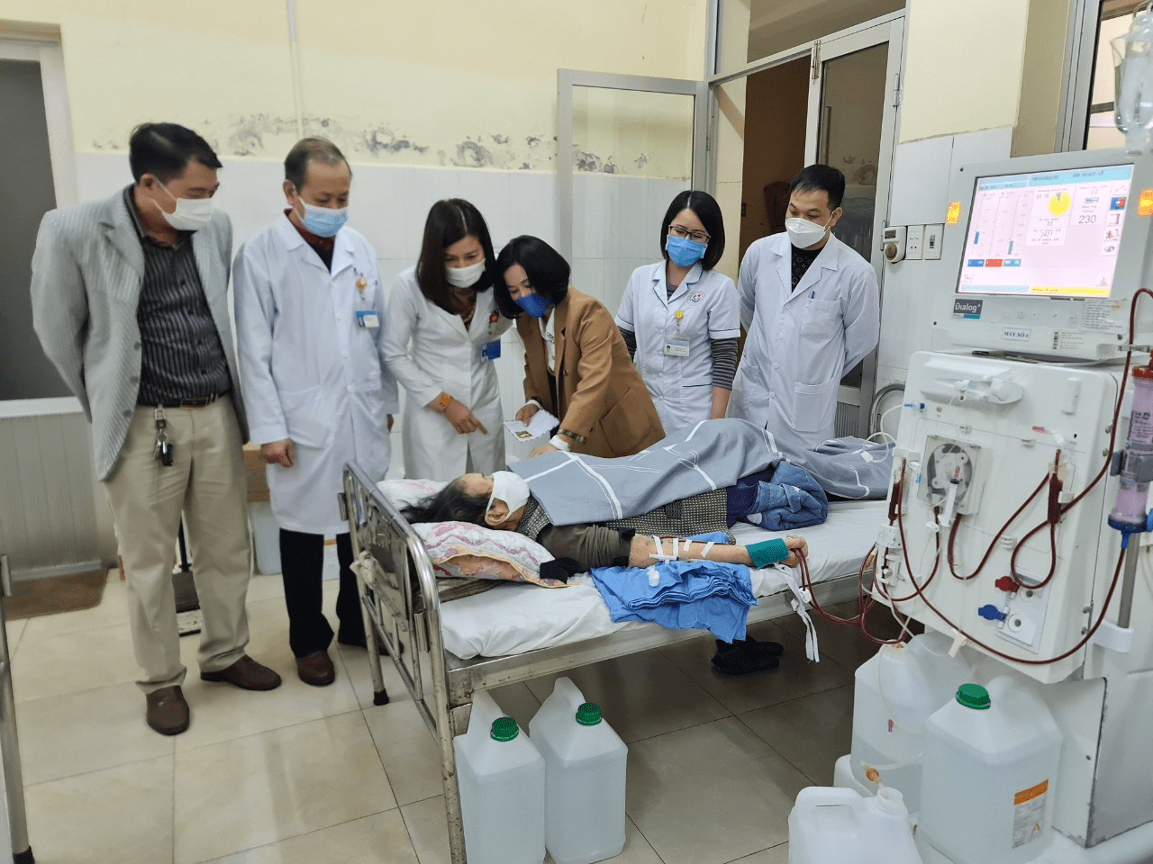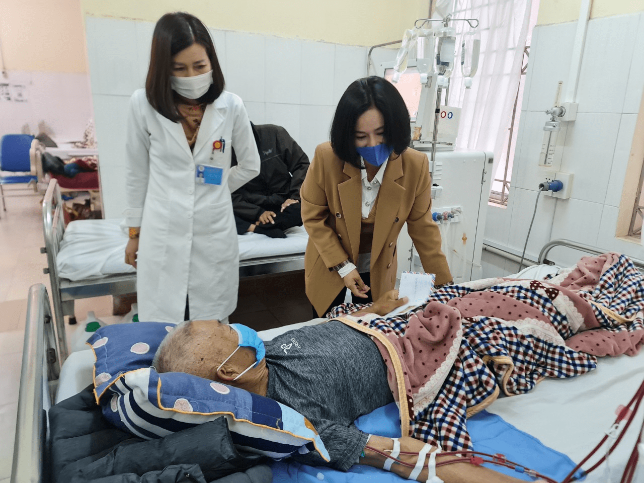 Đại diện lãnh đạo Trung tâm Y tế và gia đình chị Hải thăm hỏi, động viên và tặng quà cho bệnh nhân đang chạy thận tại Trung tâm Y tế TP Móng Cái