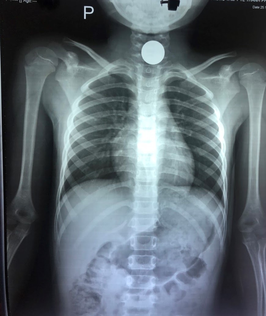 Theo lời kể gia đình, vào 12 giờ 30 phút cùng ngày bệnh nhi tự nuốt vật lạ là một đồng xu. Kết quả chụp X-quang cho thấy hình ảnh dị vật nằm ở vị trí thực quản vùng cổ.