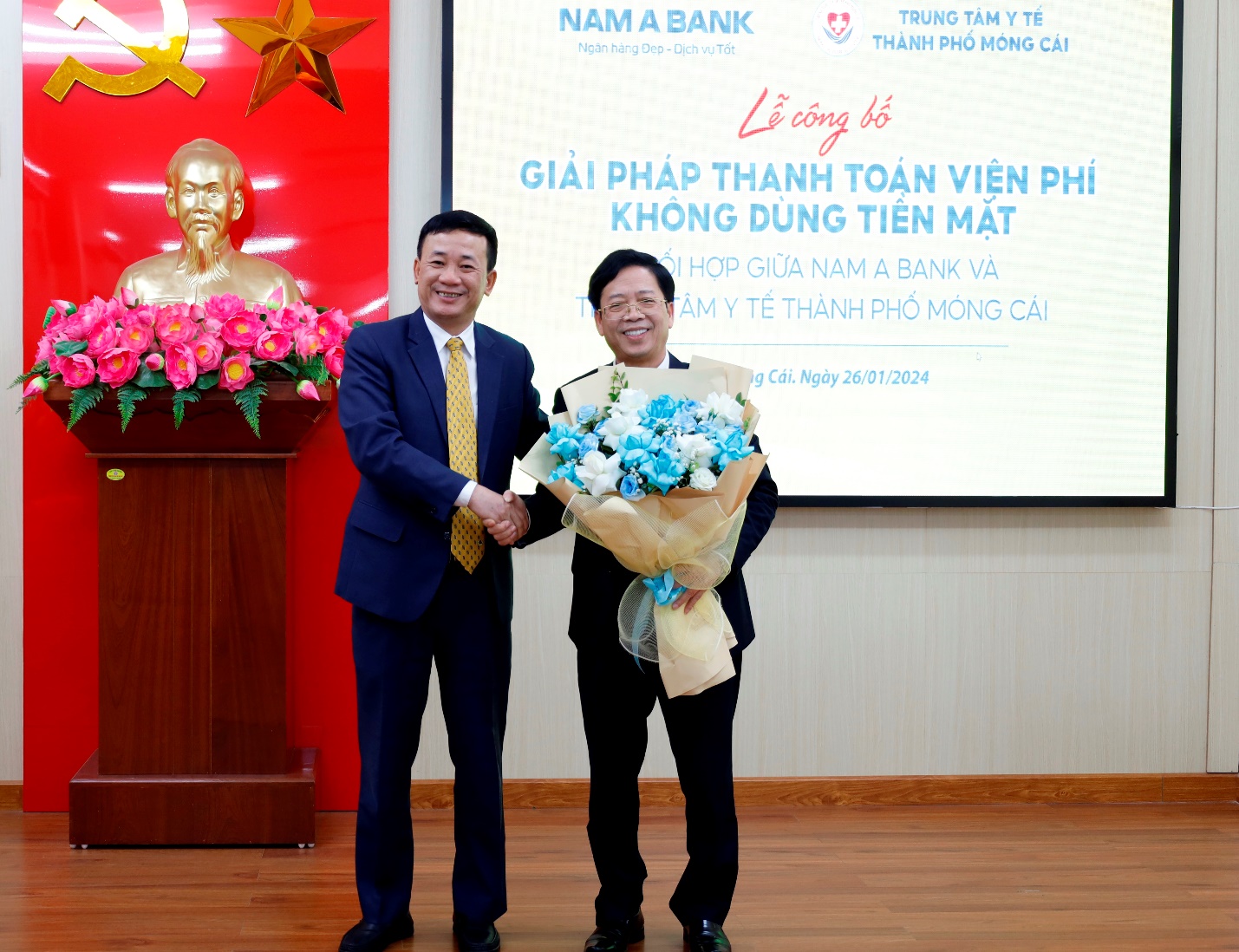 Ngày 26/1, Ngân hàng TMCP Nam Á và Trung tâm y tế TP Móng Cái đã tổ chức lễ công bố triển khai giải pháp thanh toán viện phí không dùng tiền mặt. Thạc sỹ, Bác sỹ Đoàn Ngọc Thủy - Giám đốc Trung tâm y tế Móng Cái cùng Ban giám đốc Trung tâm y tế TP; Ông Trần Thanh Tùng - Giám đốc Khối khách hàng doanh nghiệp Nam A Bank; ông Nguyễn Quang Thông - Phó Giám đốc Khối Khách hàng cá nhân kiêm Giám đốc Trung tâm Ngân hàng số đã đến dự