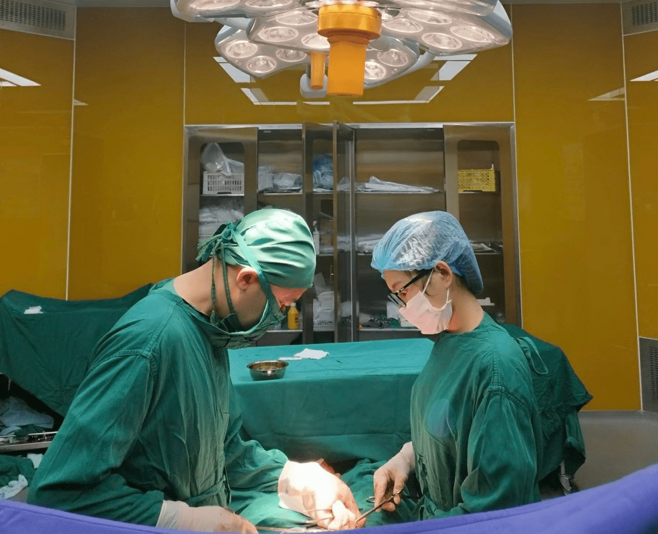 Kíp phẫu thuật do Bs. Nguyễn Hữu Cao, trưởng khoa CSSKSS/Phụ sản, Bs. Vũ Thuỳ Linh, Bs. Phạm Thái Bình và kỹ thuật viên thực hiện.