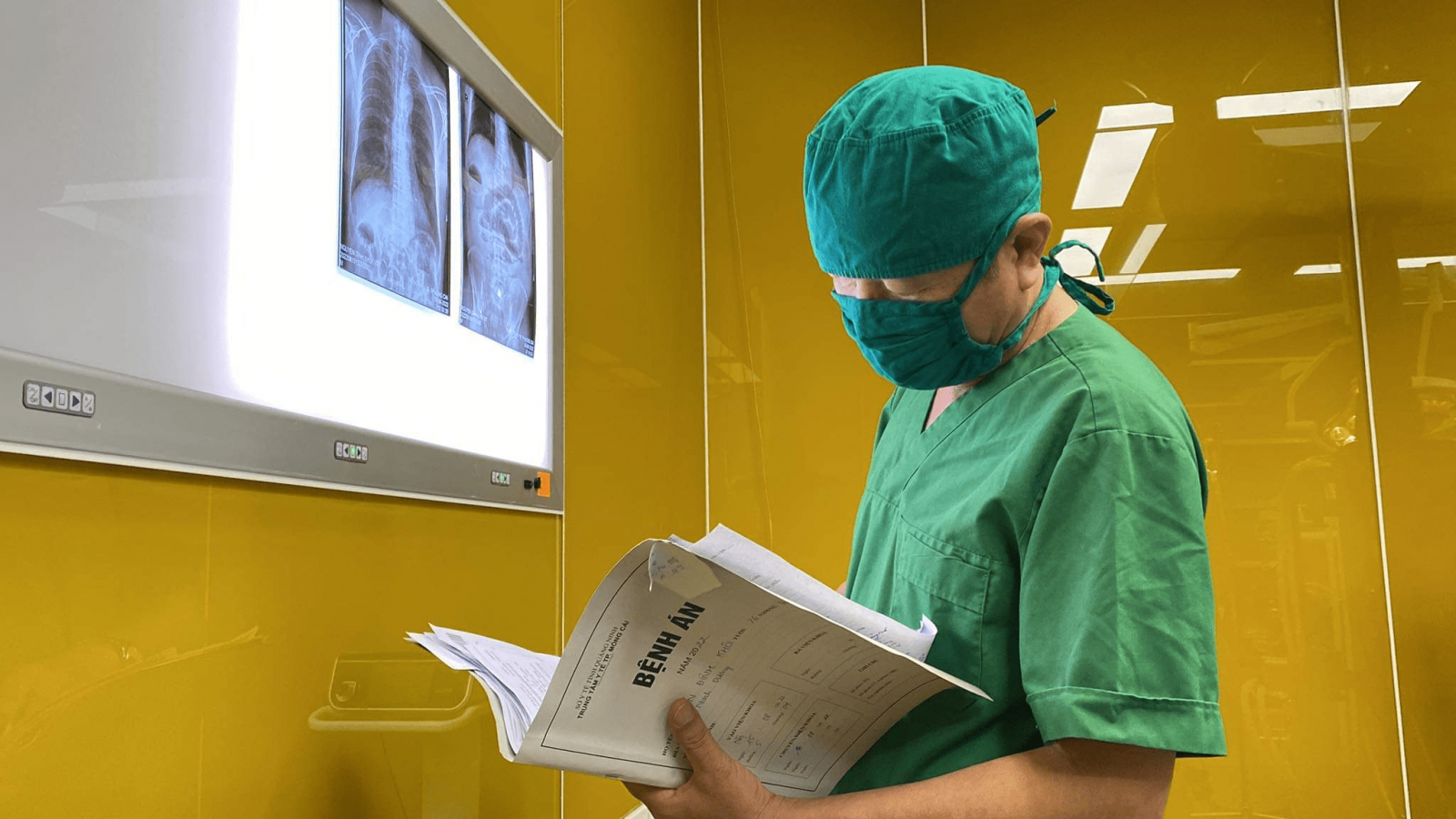 TTND Bác sĩ Chuyên khoa II Nguyễn Quốc Hùng, kiểm tra bệnh án của bệnh nhân trước khi phẫu thuật
