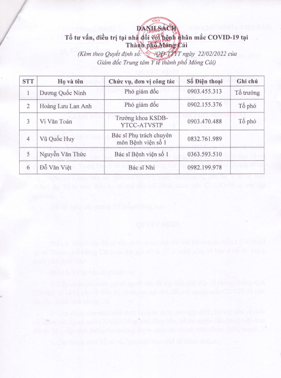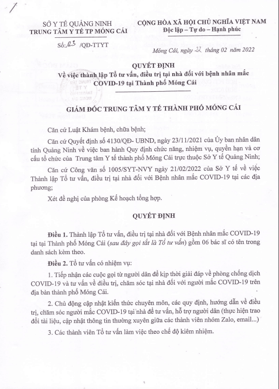 Thứ 3, 22/02/2022 | 16:05 A- A A+ | Quyết định V/v Thành lập Tổ tư vấn, điều trị tại nhà đối với bệnh nhân mắc COVID - 19 tại Thành phố Móng Cái Đọc bài Lưu Tổng số điểm của bài viết là: 0 trong 0 đánh giá Click để đánh giá bài viết