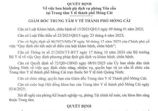 Quyết định về việc ban hành giá dịch vụ phòng Yêu cầu tại Trung tâm Y tế thành phố Móng Cái