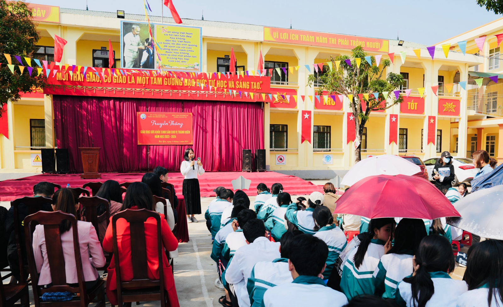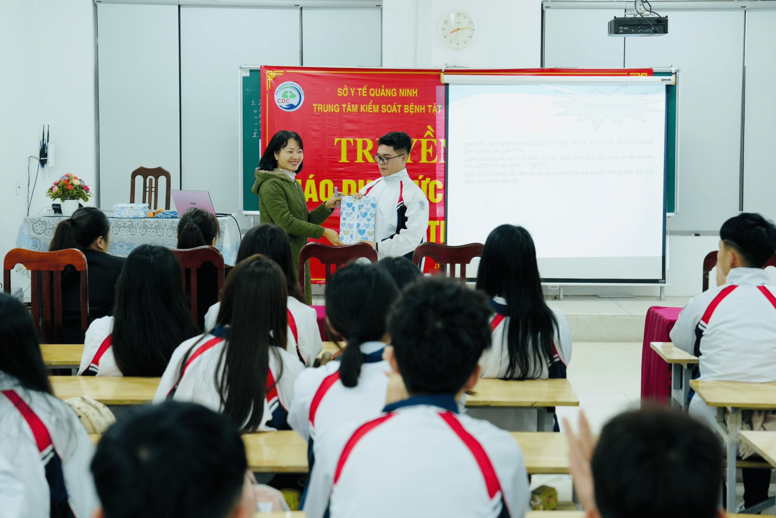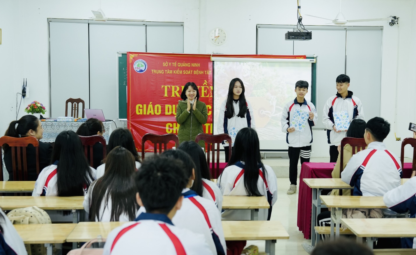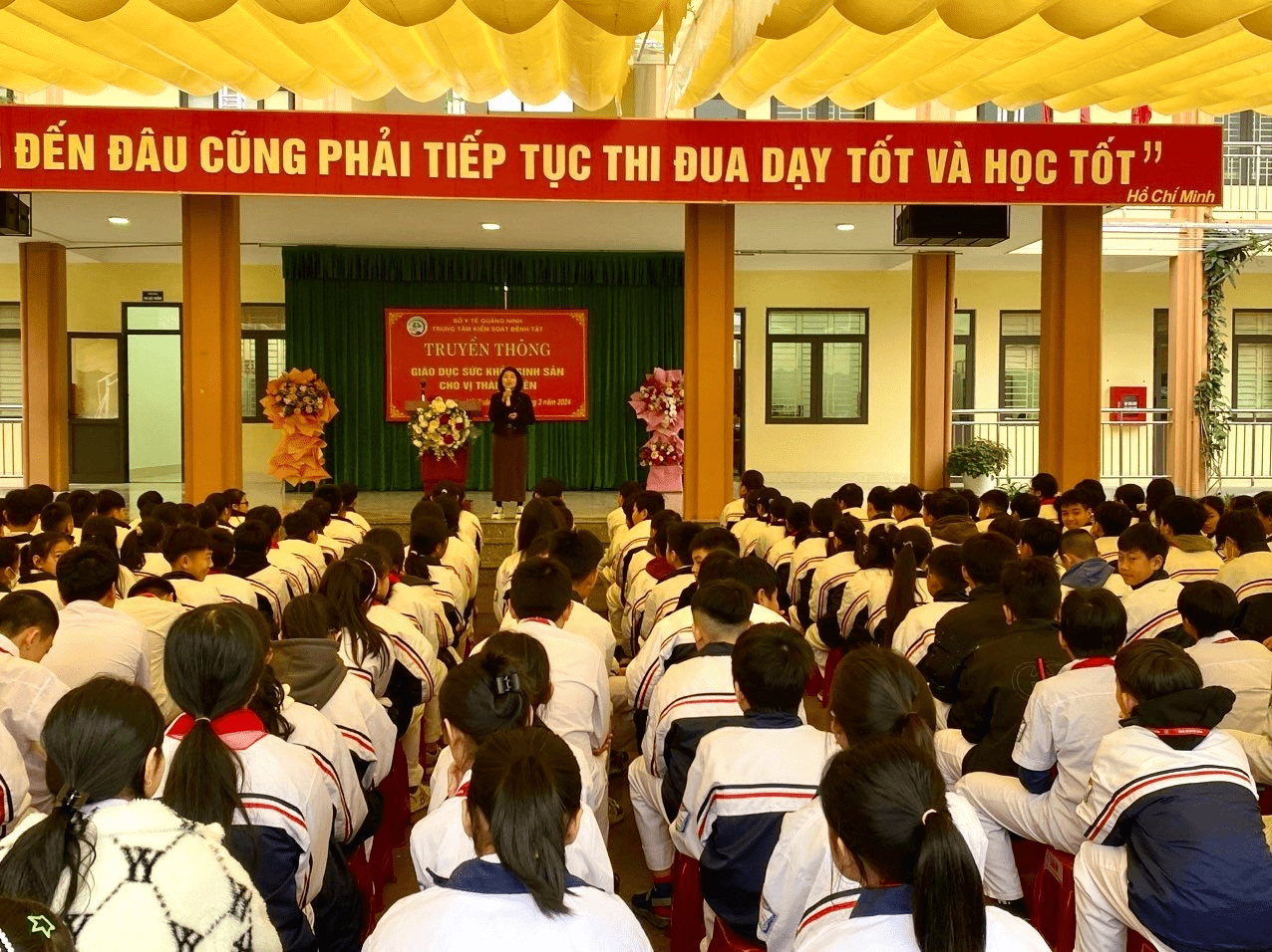 Nhận thức được tầm quan trọng của việc cung cấp, giáo dục kiến thức chăm sóc sức khỏe sinh sản cho các học sinh trong độ tuổi vị thành niên (10-19 tuổi) không chỉ là trách nhiệm của gia đình, thầy cô, mà còn là sự chung tay, góp sức của toàn xã hội. Ngày 11/3/2024, Trung tâm kiểm soát bệnh tật Tỉnh phối hợp với Trung tâm Y tế Thành phố Móng Cái, Ban giám hiệu trường THPT, THCS trên địa bàn Thành phố Móng Cái tổ chức giao lưu, tuyên truyền giáo dục về sức khỏe sinh VTN/TN, truyền thông giảm thiểu tình trạng tảo hôn cho gần 1.500 học sinh trong nhà trường.