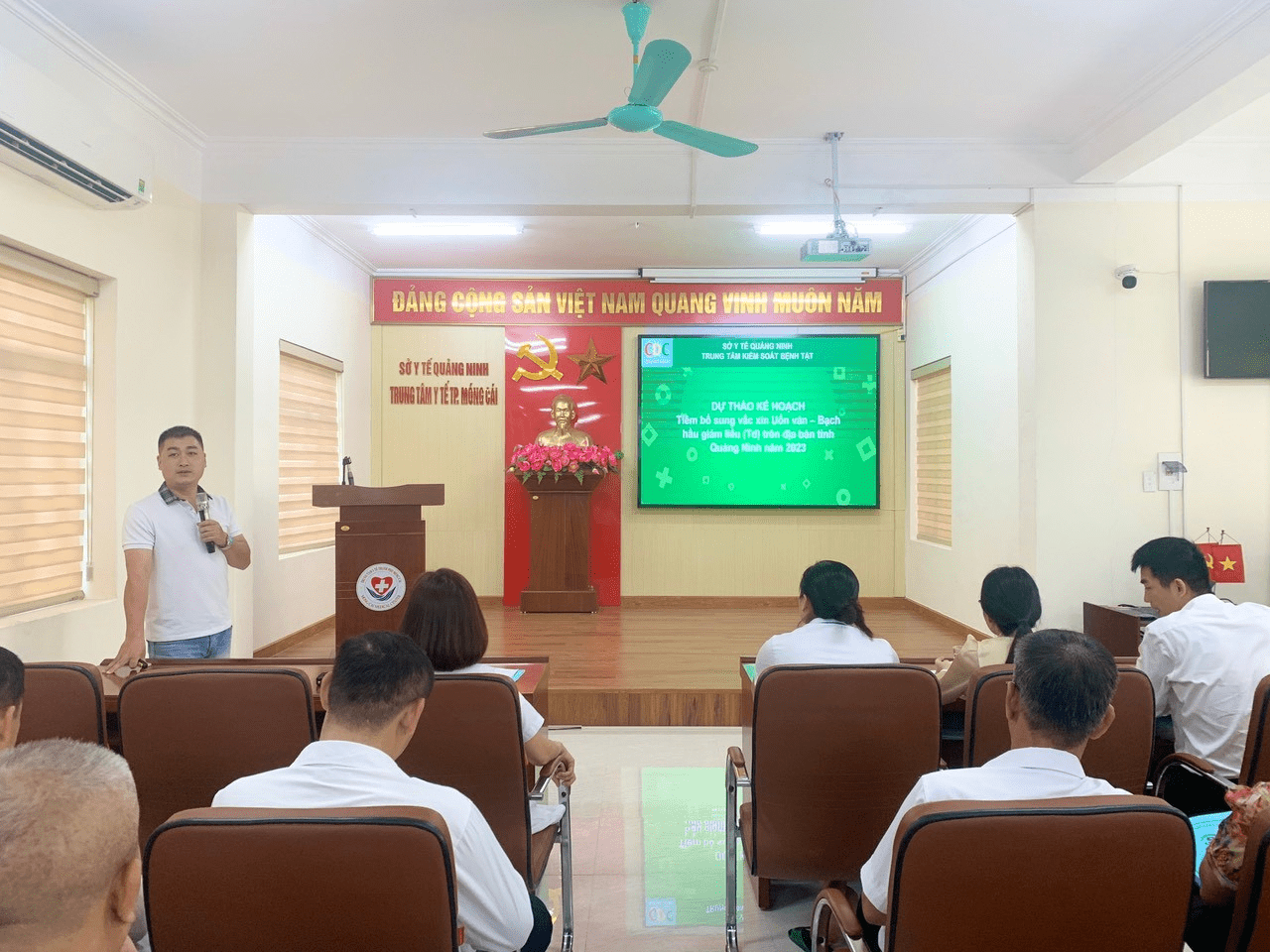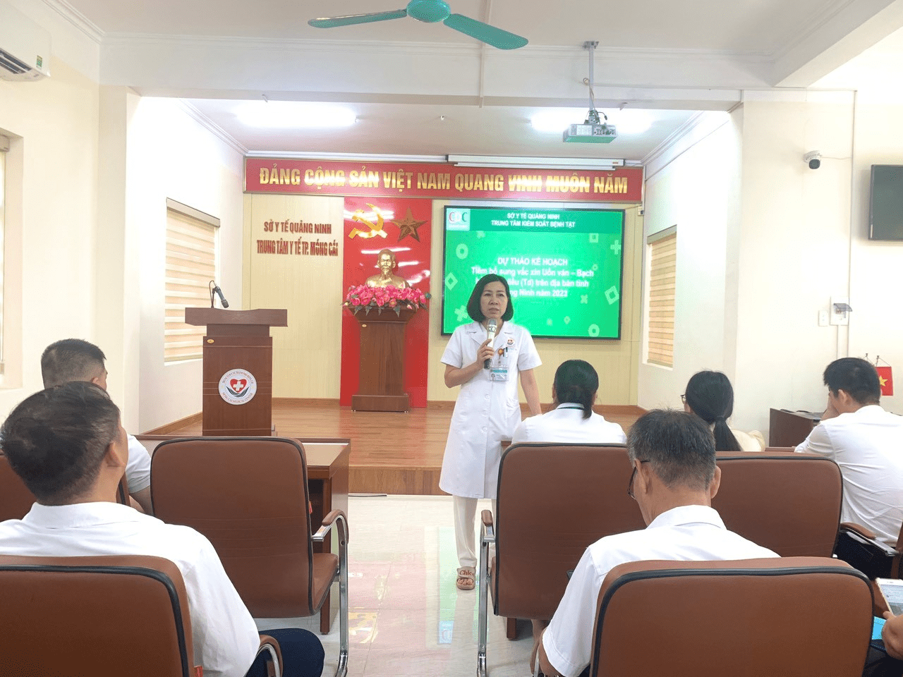 Nhằm triển khai tốt chiến dịch, đảm bảo công tác an toàn tiêm chủng. Ngày 13/10/2023, Trung tâm Y tế thành phố Móng Cái phối hợp với Trung tâm kiểm soát bệnh tật tỉnh tập huấn tiêm chủng vác xin uốn ván, bạch hầu giảm liều (Td) năm 2023 cho lãnh đạo phụ trách, cán bộ chuyên trách của trung tâm y tế, trạm y tế xã, phường và các trường tiểu học trên địa bàn thành phố về nội dung triển khai chiến dịch. Đồng chí Hoàng Lưu Lan Anh, Phó giám đốc Trung tâm Y tế TP Móng Cái dự và khai mạc lớp tập huấn.