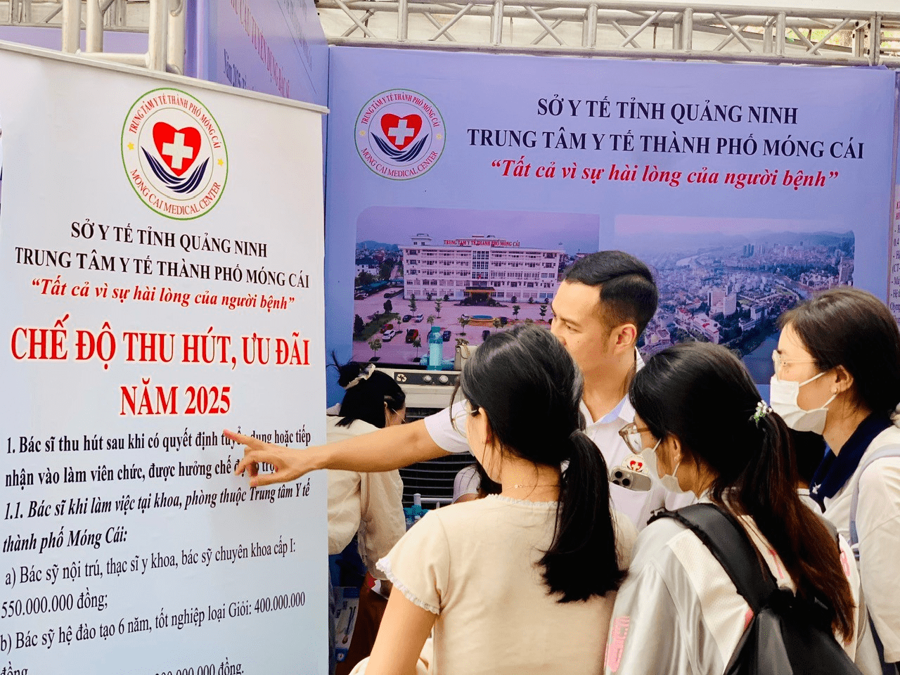 Trong năm 2025, Trung tâm Y tế thành phố Móng Cái có nhu cầu tuyển dụng 45 bác sĩ về làm việc tại Trung tâm 01 bác sĩ về làm việc tại Trạm y tế xã, ngoài chế độ thu hút theo Nghị quyết số 28/2023/NQ-HĐND ngày 08/12/2023 của Hội đồng nhân dân tỉnh Quảng Ninh với mức hỗ trợ cao nhất lên đến 550 triệu đồng, bác sĩ về làm việc tại trung tâm còn được hưởng một số ưu đãi theo Quy chế của Trung tâm: Hỗ trợ hàng tháng; Hỗ trợ nhà ở; hỗ trợ đào tạo,…