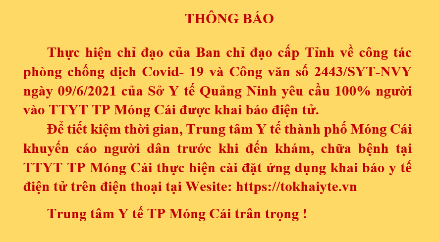 Thực hiện chỉ đạo của Ban chỉ đạo cấp Tỉnh về công tác phòng chống dịch Covid- 19 và Công văn số 2443/SYT-NVY ngày 09/6/2021 của Sở Y tế Quảng Ninh yêu cầu 100% người vào TTYT TP Móng Cái được khai báo điện tử.