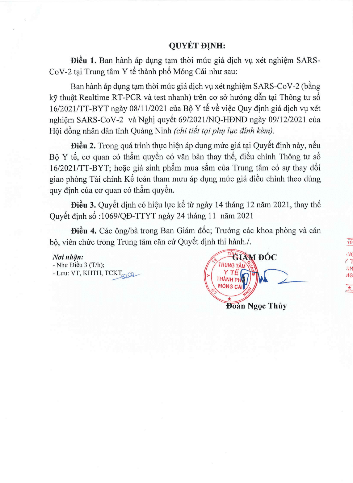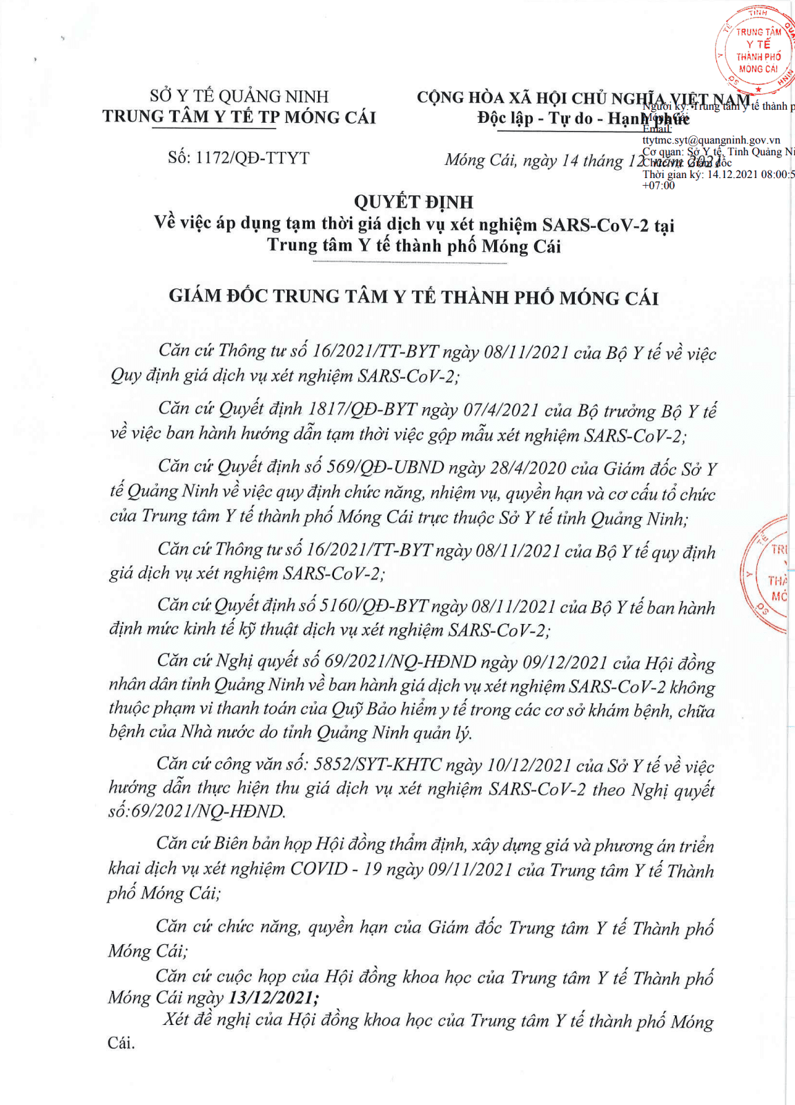 Thứ 3, 14/12/2021 | 10:58 A- A A+ | Thông báo tạm thời giá dịch vụ xét nghiệm SARS-CoV-2 tại Trung tâm Y tế TP Móng Cái Quyết định số 1172/QĐ-TTYT Đọc bài Lưu Tập tin đính kèm Trình duyệt không hỗ trợ iframe. Tổng số điểm của bài viết là: 0 trong 0 đánh giá Click để đánh giá bài viết