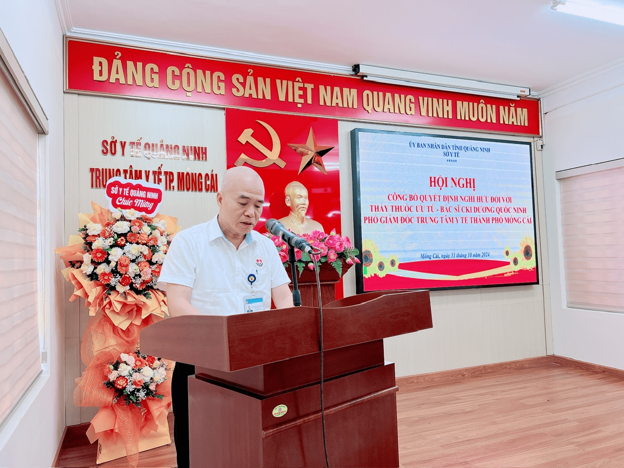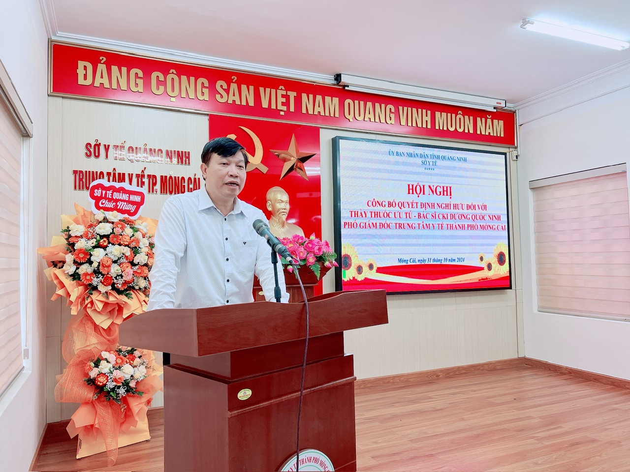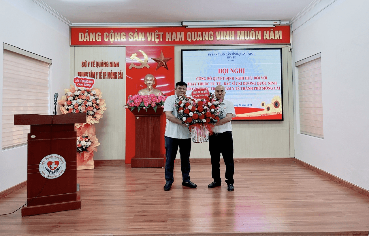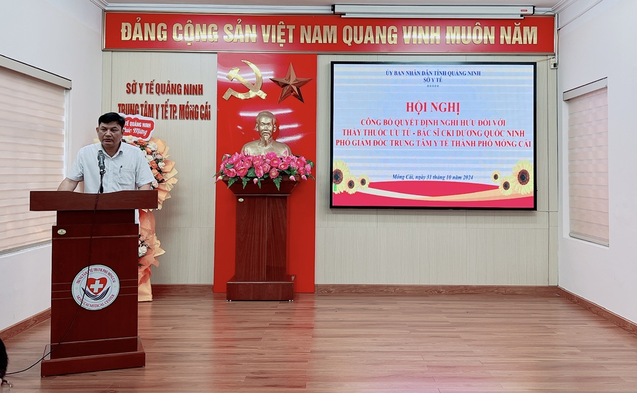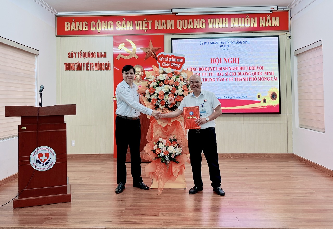 Chiều 31/10/2024, tại Trung tâm Y tế thành phố Móng Cái, thừa ủy quyền của đồng chí Giám đốc Sở Y tế tỉnh Quảng Ninh, đồng chí Nguyễn Minh Tuấn, Phó Giám đốc Sở Y tế đã trao Quyết định nghỉ hưu theo chế độ cho Thầy thuốc ưu tú, Bác sĩ chuyên khoa I Dương Quốc Ninh, Phó giám đốc Trung tâm Y tế thành phố Móng Cái.