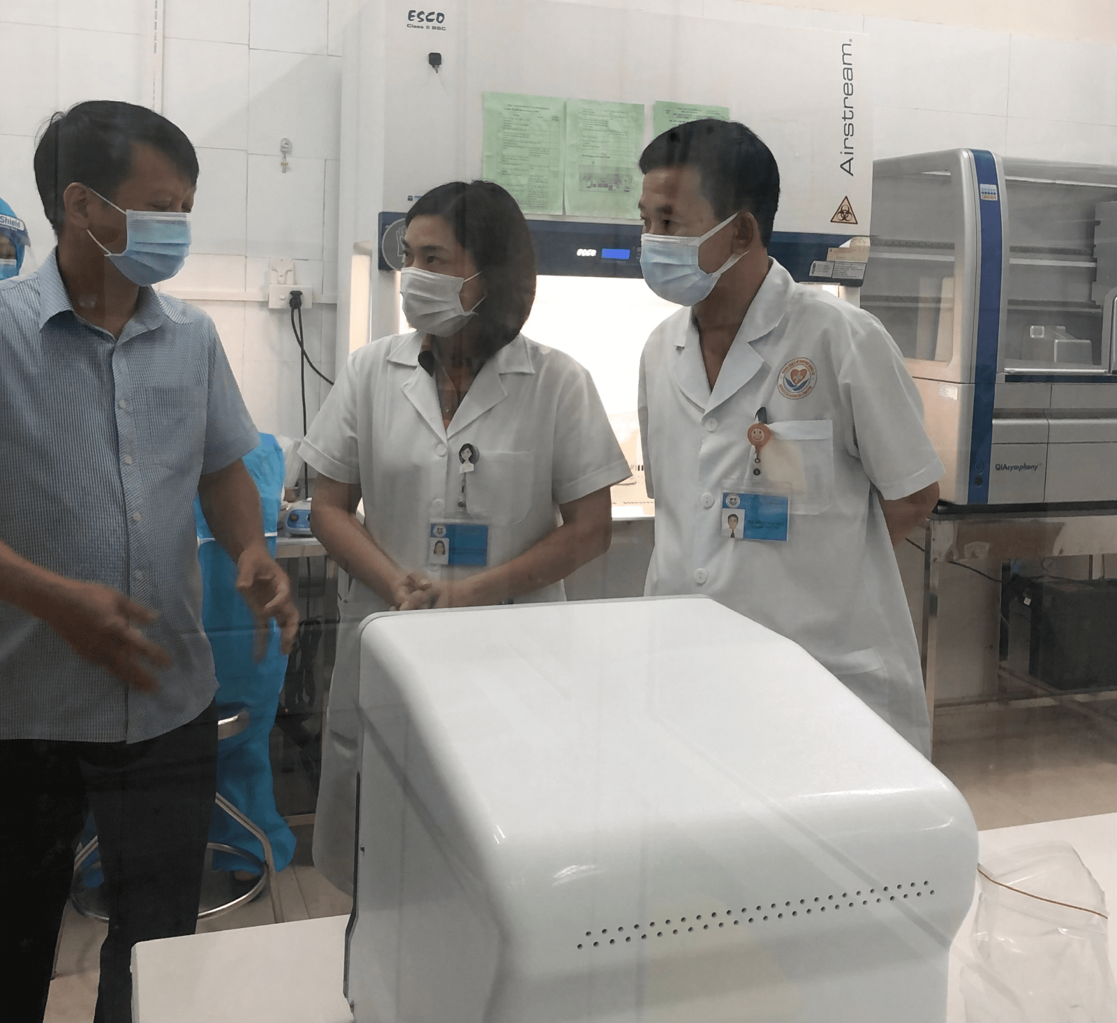 Đồng chí Hồ Quang Huy, Chủ tịch UBND TP Móng Cái kiểm tra quá trình lắp đặt, vận hành hệ thống xét nghiệm Realtime- PCR do thành phố Móng Cái tặng Trung tâm Y tế TP Móng Cái