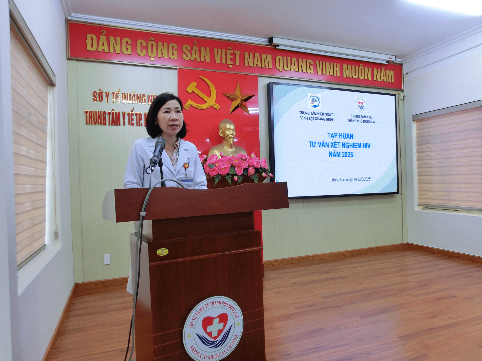 Phát biểu khai mạc tại lớp tập huấn, BS.CKII Hoàng Lưu Lan Anh – Phó giám đốc Trung tâm Y tế thành phố Móng Cái, nhấn mạnh: Vai trò của công tác tư vấn và xét nghiệm HIV rất quan trọng, tập huấn kiến thức về tư vấn xét nghiệm HIV giúp học viên nắm vững kỹ năng để áp dụng triển khai có hiệu quả phục vụ công tác khám, chữa bệnh và đẩy mạnh tư vấn xét nghiệm HIV để tìm ca nhiễm HIV trong cộng đồng. Đồng chí yêu cầu học viên tham gia đầy đủ và thực hiện nghiêm túc chương trình tập huấn.