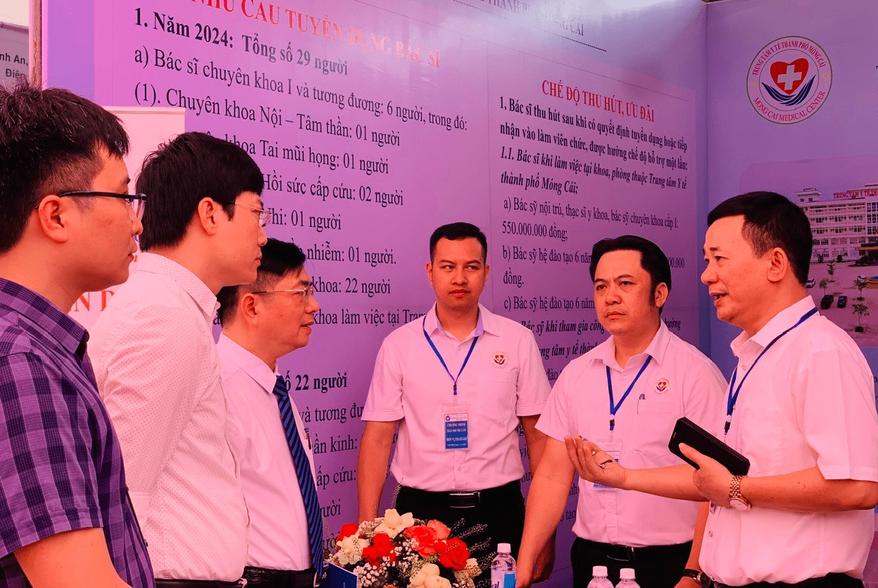 Tại “Ngày hội việc làm 2024”, gian hàng của Trung tâm Y tế thành phố Móng Cái đã thu hút trên 100 lượt sinh viên, đại biểu đến tham quan tìm hiểu về nhu cầu thu hút, tuyển dụng cũng như định hướng của Trung tâm trong năm 2024 và những năm tiếp theo. Tại đây các sinh viên được Giám đốc Trung tâm, Trưởng phòng tổ chức cùng các thành viên trong Đoàn công tác của Trung tâm giới thiệu về trung tâm, hướng dẫn, tư vấn, giải đáp các thắc mắc về thông tin tuyển dụng cũng như chế độ đãi ngộ, cơ hội phát triển nghề khi được tuyển dụng vào làm việc tại Trung tâm Y tế thành phố Móng Cái. Đã có trên 50 ứng viên đăng ký nhu cầu về đơn vị công tác theo chuyên khoa mong muốn và phù hợp năng lực của bản thân.