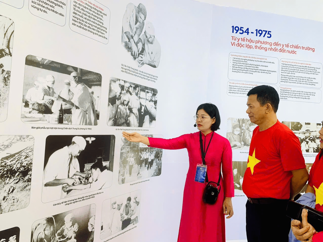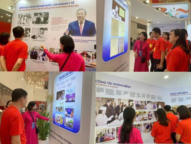 Tại khu trưng bày của các bộ, ngành Trung ương, gian triển lãm của Bộ Y tế với chủ đề “Y tế Việt Nam – Hành trình 80 năm vì sức khỏe nhân dân” đã thu hút sự quan tâm đặc biệt của đoàn. Không gian triển lãm được thiết kế hiện đại, ứng dụng công nghệ số và công nghệ tương tác, giới thiệu khái quát hành trình phát triển của ngành Y tế Việt Nam. Đặc biệt, những thước phim, hình ảnh tư liệu quý của ngành y tế, mô hình bệnh viện thông minh, hình ảnh đội ngũ nhân viên y tế nơi tuyến đầu chống dịch COVID-19, cùng các công trình khoa học tiêu biểu mang tầm quốc gia và quốc tế… đã mang đến cho cán bộ, nhân viên y tế niềm tự hào sâu sắc, tiếp thêm động lực để không ngừng phấn đấu, cống hiến cho sự nghiệp chăm sóc và bảo vệ sức khỏe nhân dân.