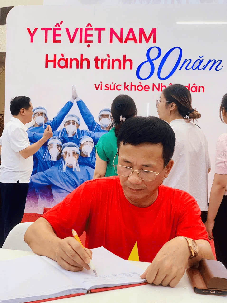 Đồng chí Đoàn Ngọc Thủy, Giám đốc Trung tâm y tế TP Móng Cái ghi sổ lưu niệm tại khu trưng bày triển lãm của Bộ Y tế