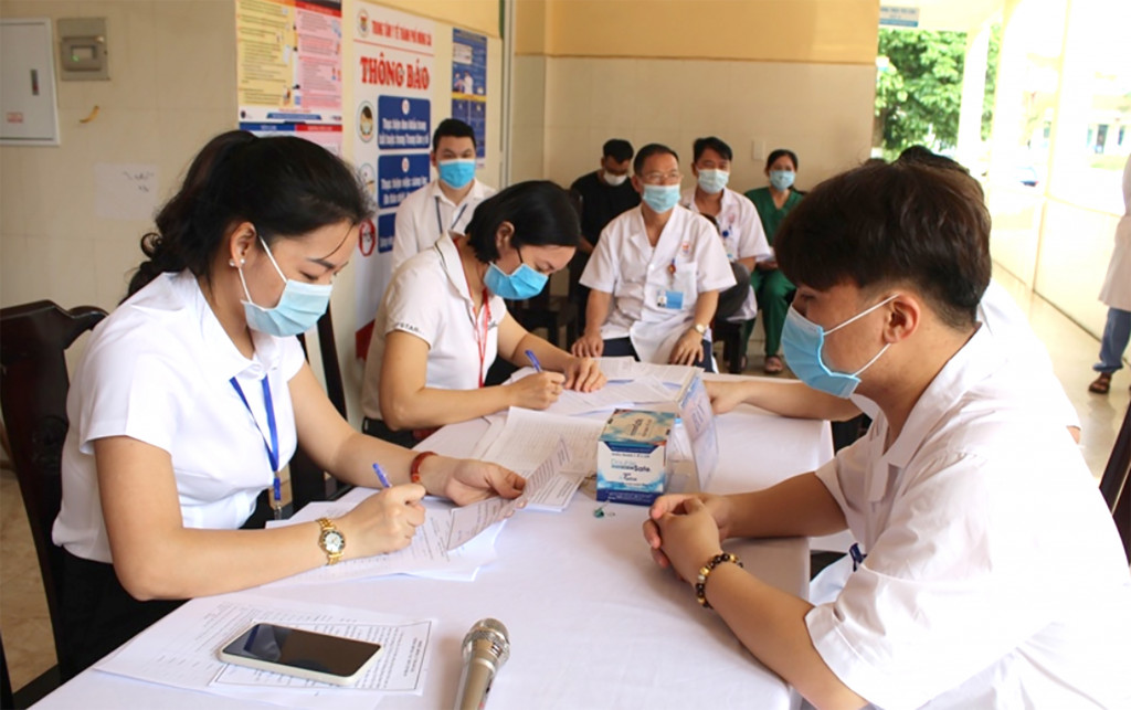 Trung tâm Y tế TP Móng Cái kiểm tra thông tin, khám sàng lọc cho cán bộ y tế trước khi tiêm vắc xin phòng Covid-19. (Ảnh: Trung tâm Y tế TP Móng Cái cung cấp)