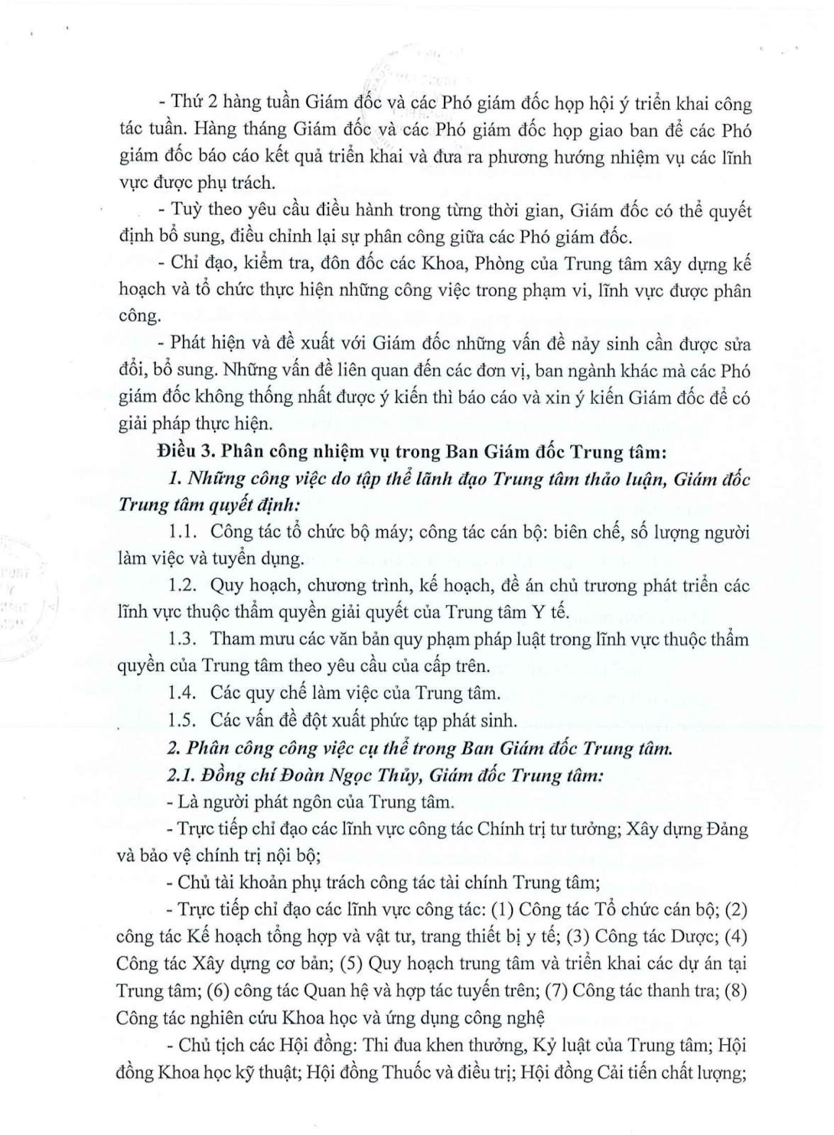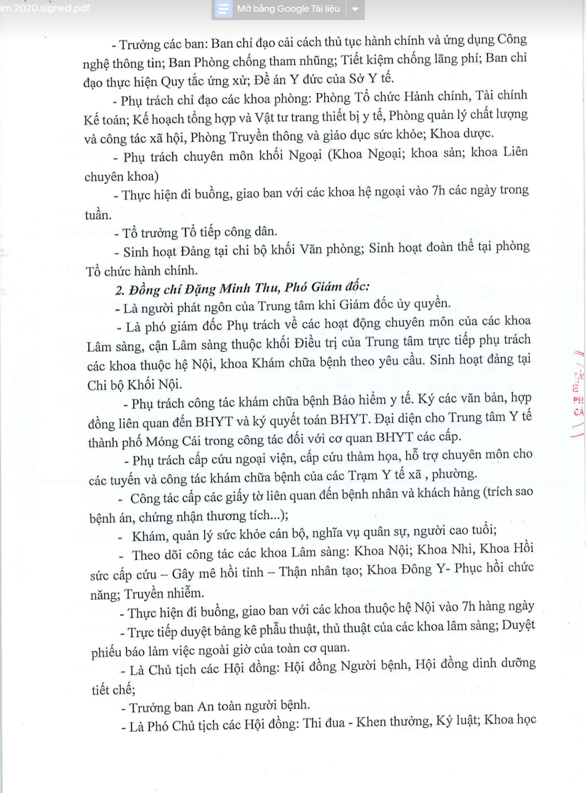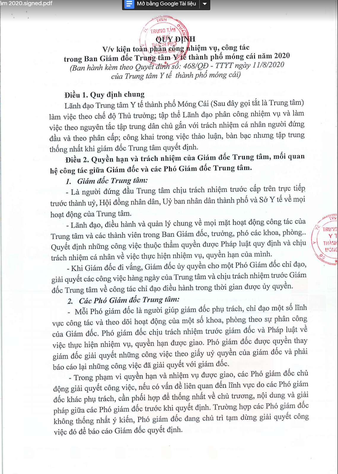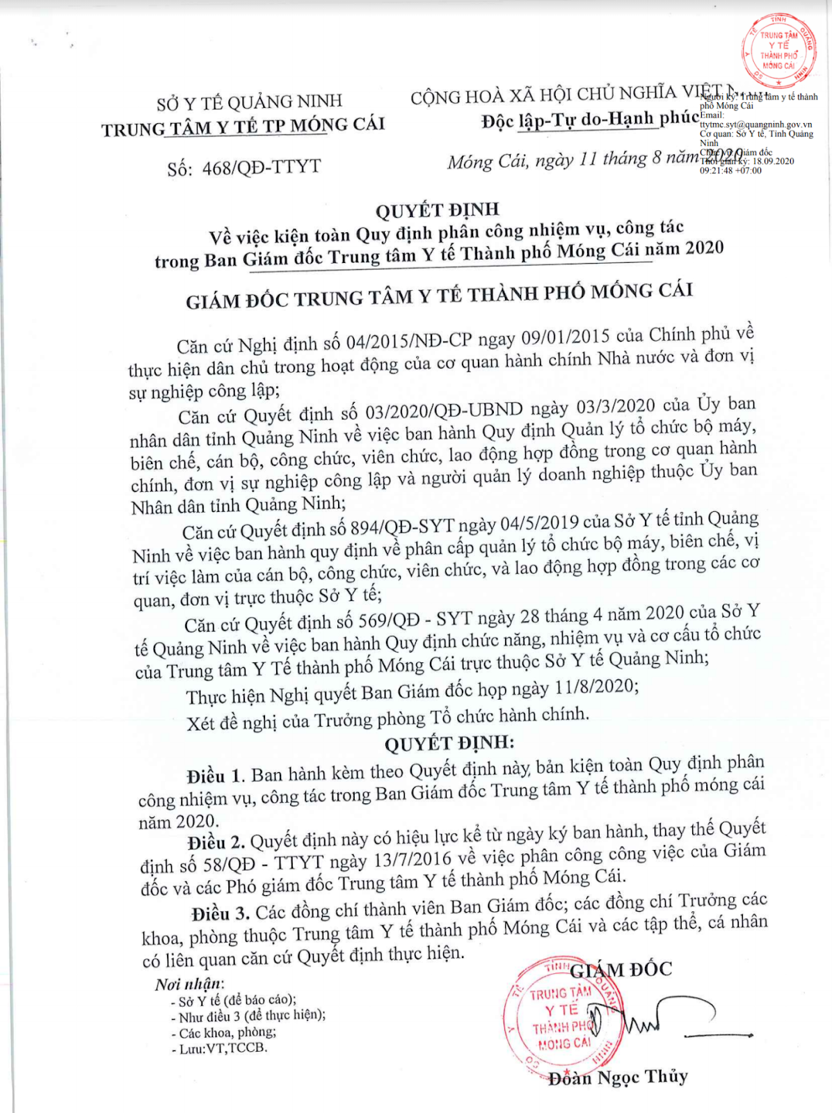 Quyết định về việc kiện toàn Quy định phân công nhiệm vụ, công tác trong Ban giám đốc Trung tâm Y tế Thành phố Móng Cái năm 2020