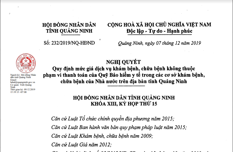 Thực hiện Công văn số 3347/SYT-KHTC ngày 18 tháng 12 năm 2019 của Sở Y tế Quảng Ninh về việc “Triển khai thực hiện Nghị quyết số 232/2019/NQ-HĐND về giá dịch vụ KCB không thuộc phạm vi thanh toán của Quỹ BHYT trong các cơ sở y tế của Nhà nước trên địa bàn tỉnh”.