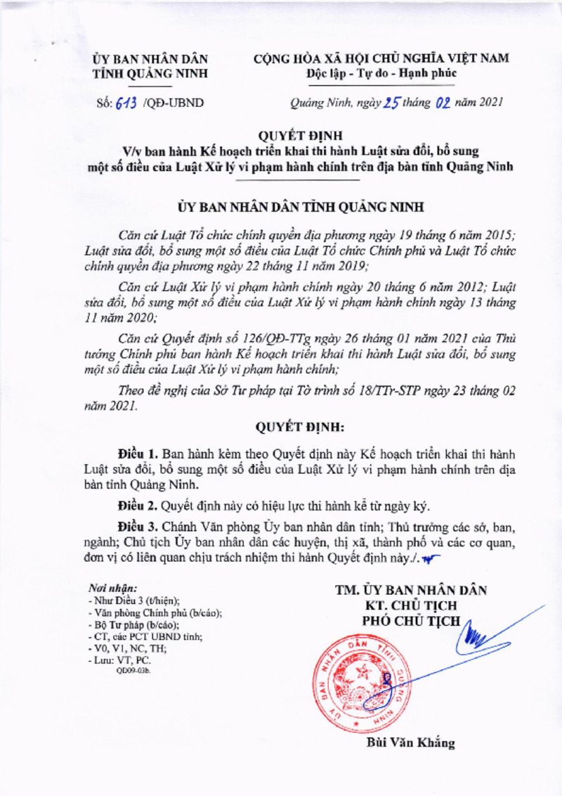 | Tiêu đề văn bản | Ban hành Kế hoạch triển khai thi hành Luật sửa đổi, bổ sung một số điều của Luật xử lý vi phạm hành chính trên địa bàn tỉnh Quảng Ninh | ||